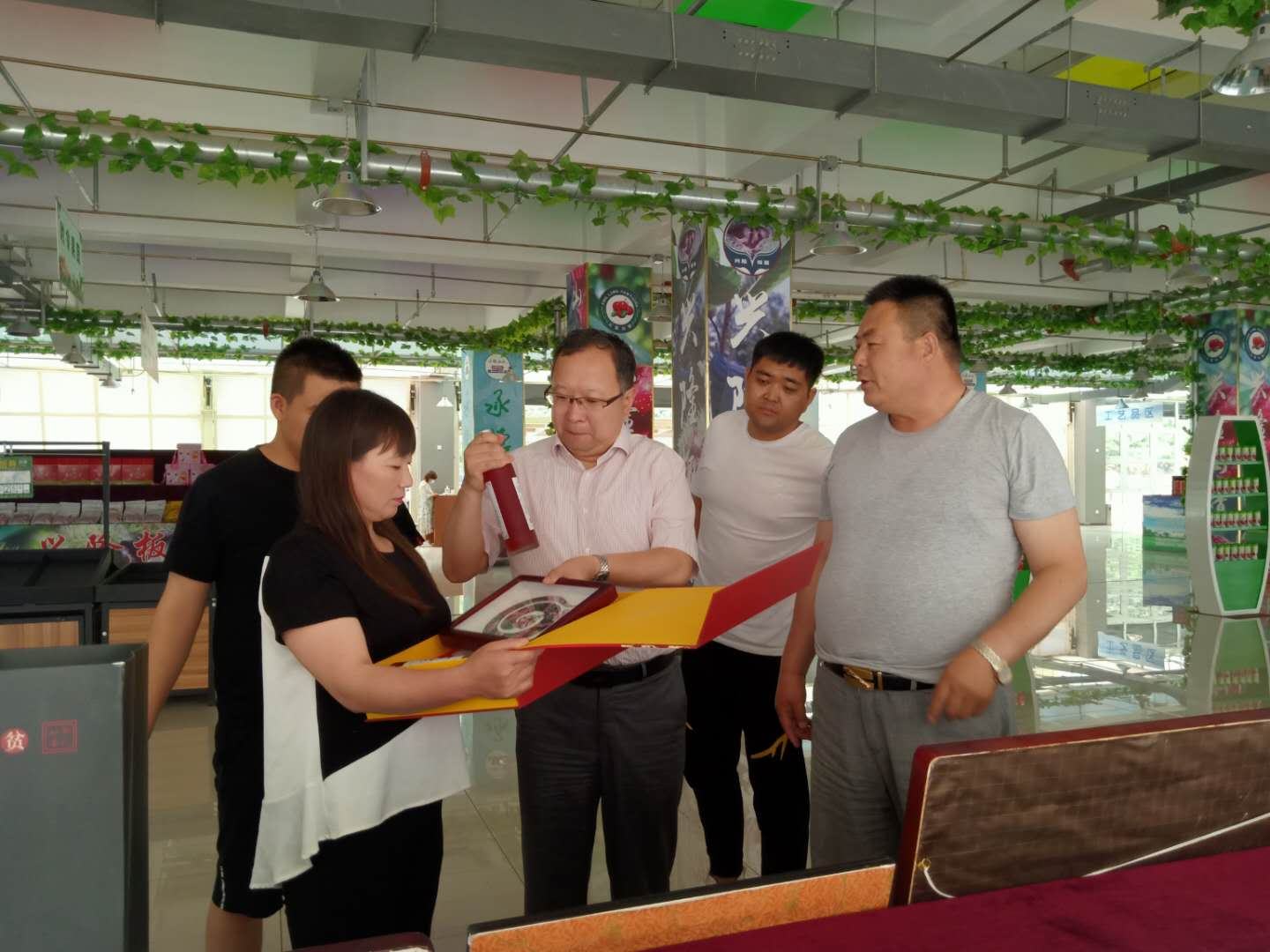 2020年6月22日,興隆縣縣委書記薛青松親臨興隆縣農產品展示展銷中心視察指導工作,期間在董事長鄭鐵軍的陪同下參觀了鄭氏砂藝展出的扶貧系列產品,薛青松書記對2019年鄭氏砂藝的扶貧工作進行了深入了解,聽取了董事長鄭鐵軍的扶貧情況匯報,并對鄭氏砂藝非遺文化扶貧工作和扶貧產品給予了高度評價。薛青松書記指出,目前脫貧攻堅是主要任務,要發揮文化企業特點,不斷學習,尋求創新,把“非遺+扶貧+旅游”的新觀念、新思路、新方法投入實踐,促進文旅融合,提高縣文化產業的可持續發展。這樣既可以帶動貧困戶脫貧致富,又能推動非物質文化遺產的傳承與發展。