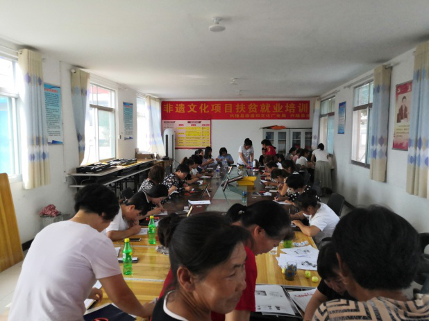 車河口村位于大杖子鎮政府東部2.5公里處,系潘家口水庫移民后靠村,處在車、柳、灤三河交匯點上。該村擁有人口1386口人,388戶。其中:貧困戶134戶,涉及貧困人口429人。由于大部分青壯勞力大都外出務工,村里只剩婦女、老人和兒童留守在家,婦女們除了給幾畝地玉米除除草,剩余時間全部用在哄孩子和閑聊上。鄭氏砂藝非遺文化扶貧項目的介入,得到廣大村民的積極響應,紛紛來到村委會參加培訓,她們仔細聽講,認真研學。學員們從描摹到布絲、從調膠到鋪砂,不放過每一個細節。在手中的作品上展現自己的才華。目前公司已對該村成立“車河口村非遺扶貧就業工坊”,在貧困戶中選出了技術過硬、能力較強的婦女擔任車間主任,目前該就業工坊已正式運轉。