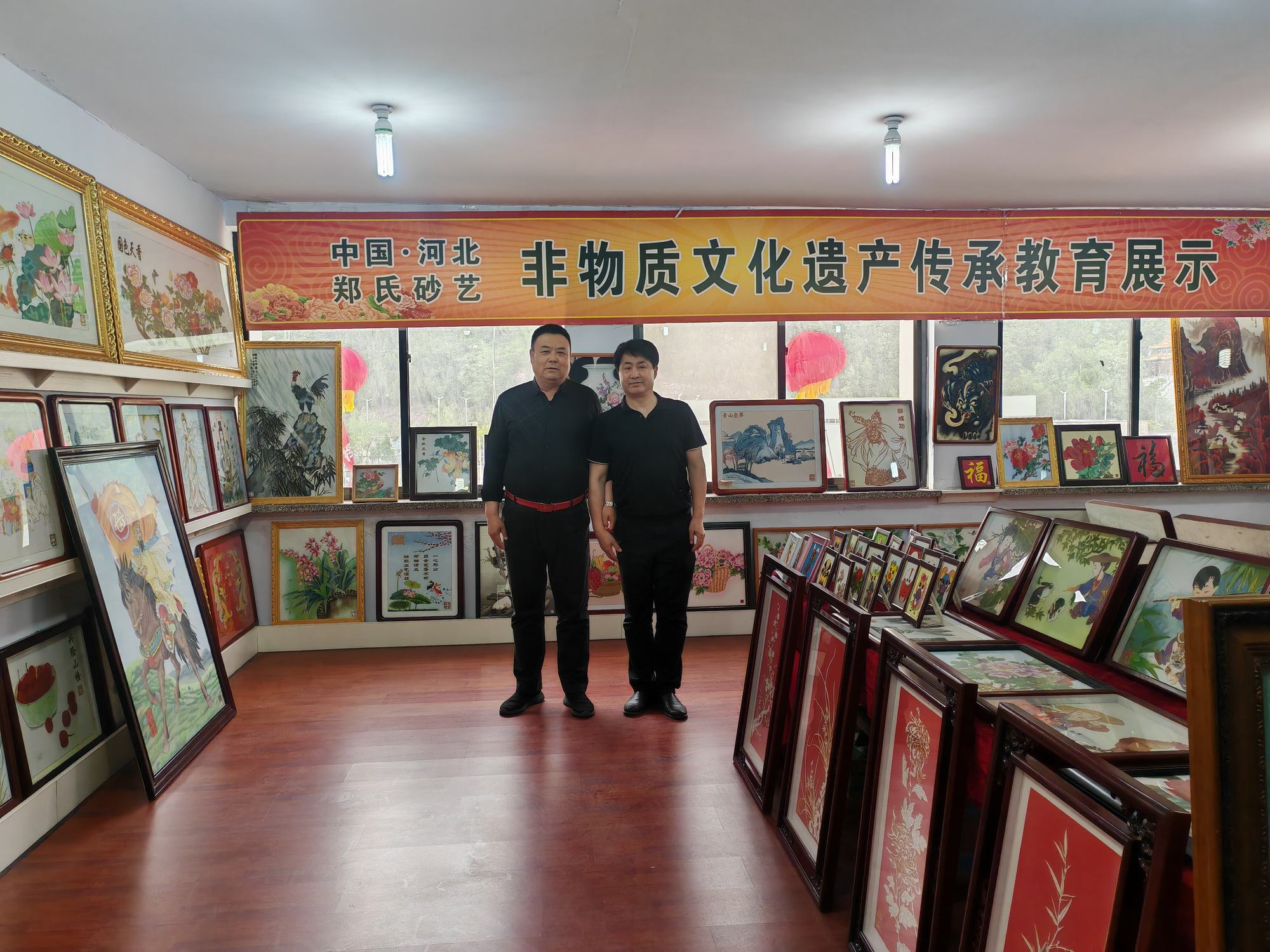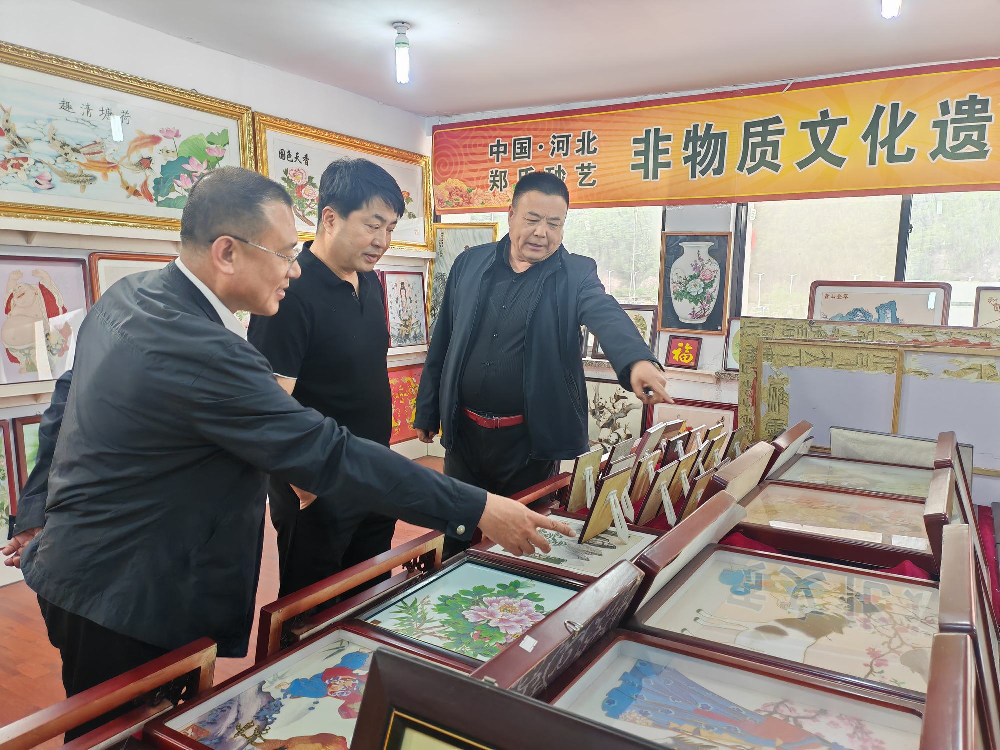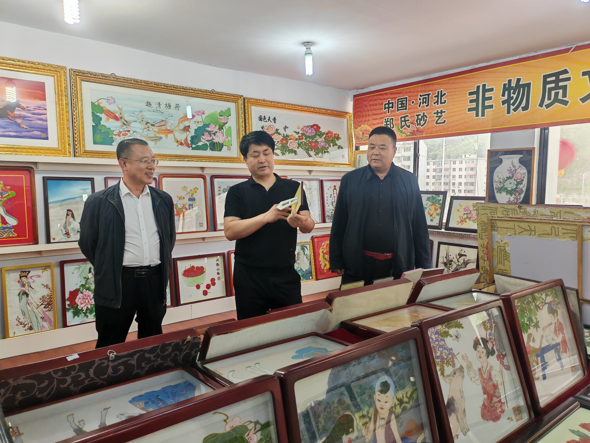 程志忠書記等一行在鄭氏砂藝董事長鄭鐵軍的陪同下,參觀了鄭氏砂藝非遺文化展館,了解了鄭氏砂藝非遺文化的傳承和發(fā)展。隨后,實地觀察了鄭氏砂藝(畫)的制作過程,并與砂藝技師們進行了交流,了解了砂畫制作原料和技藝手法。