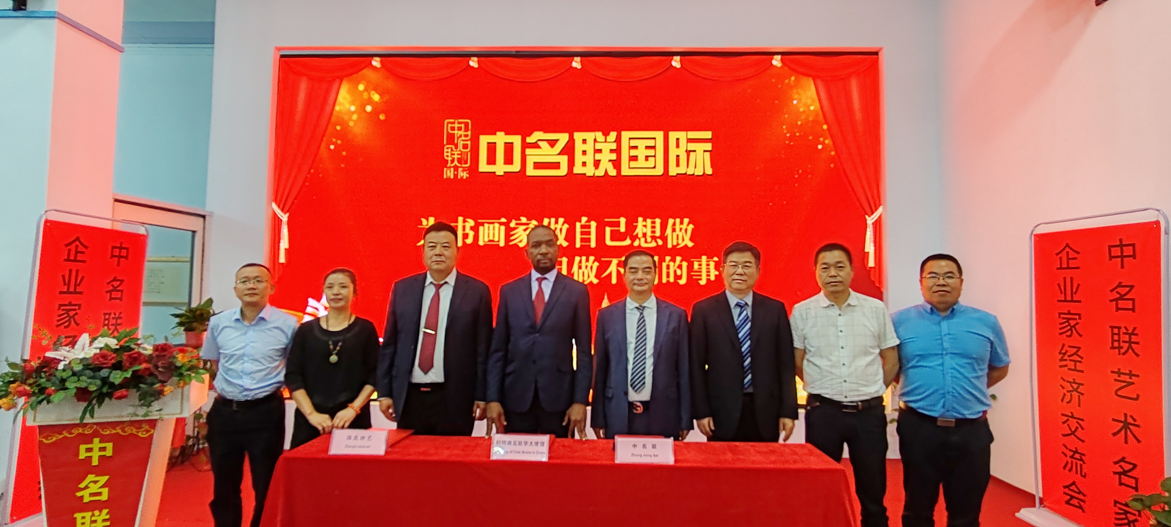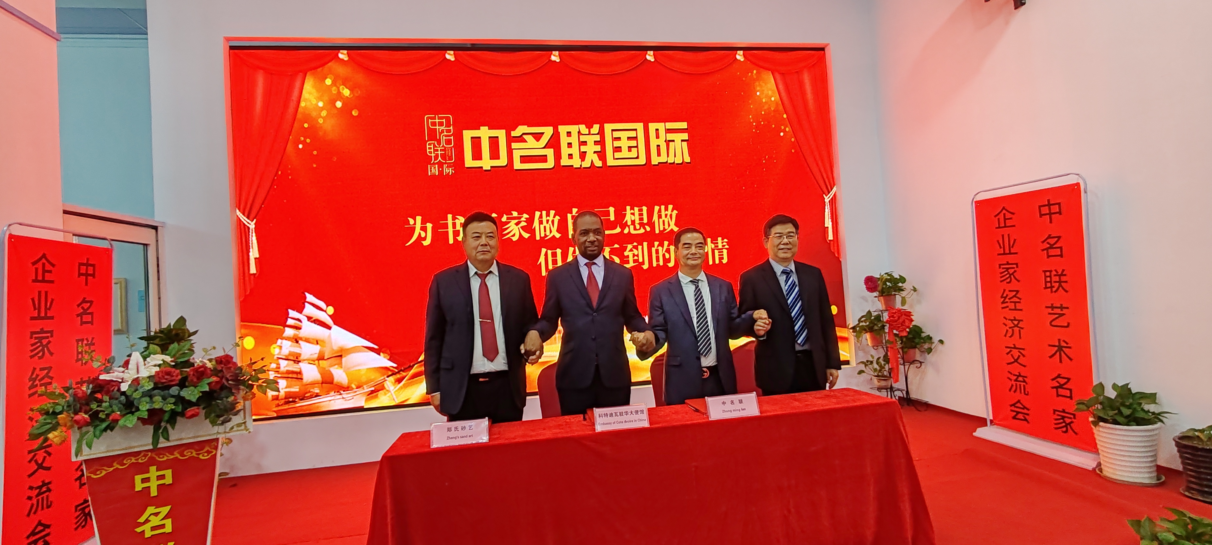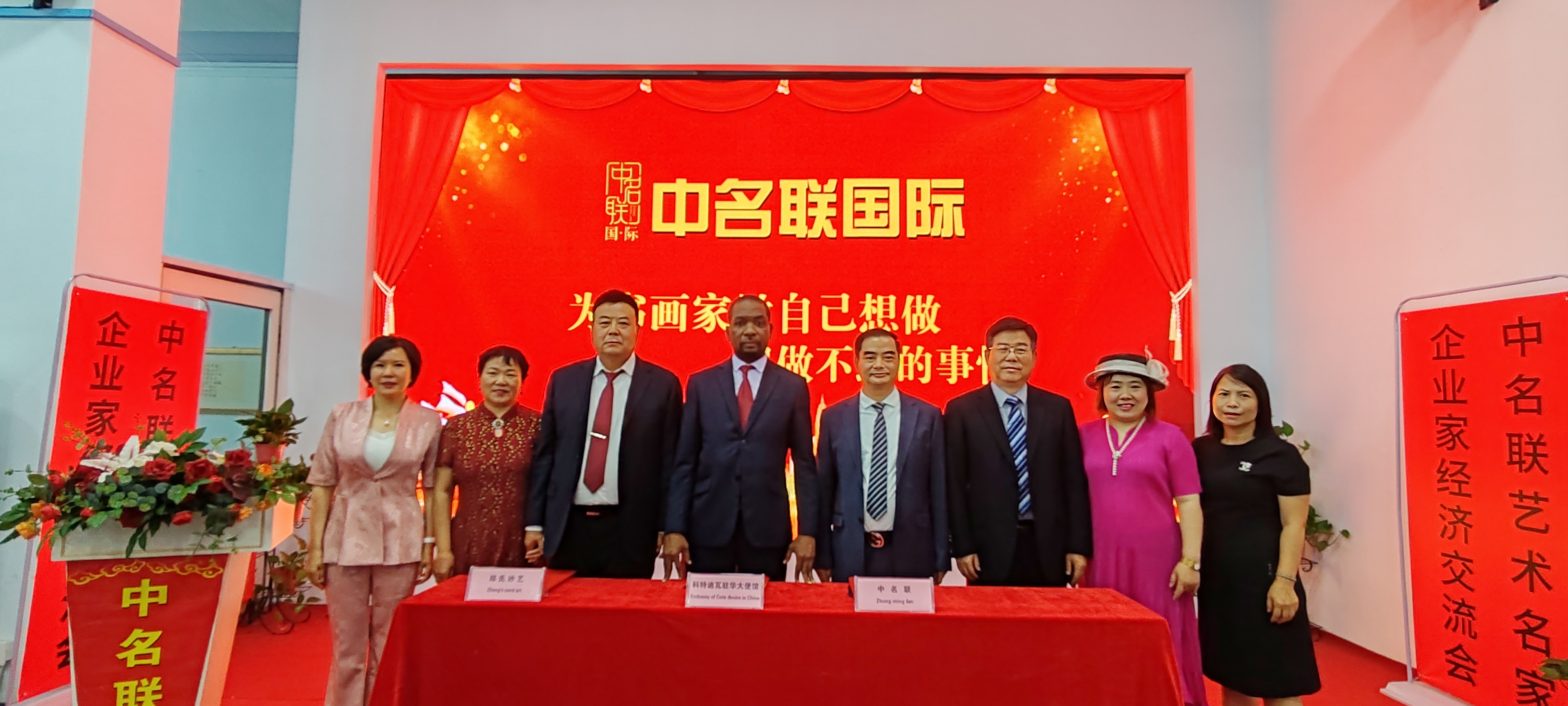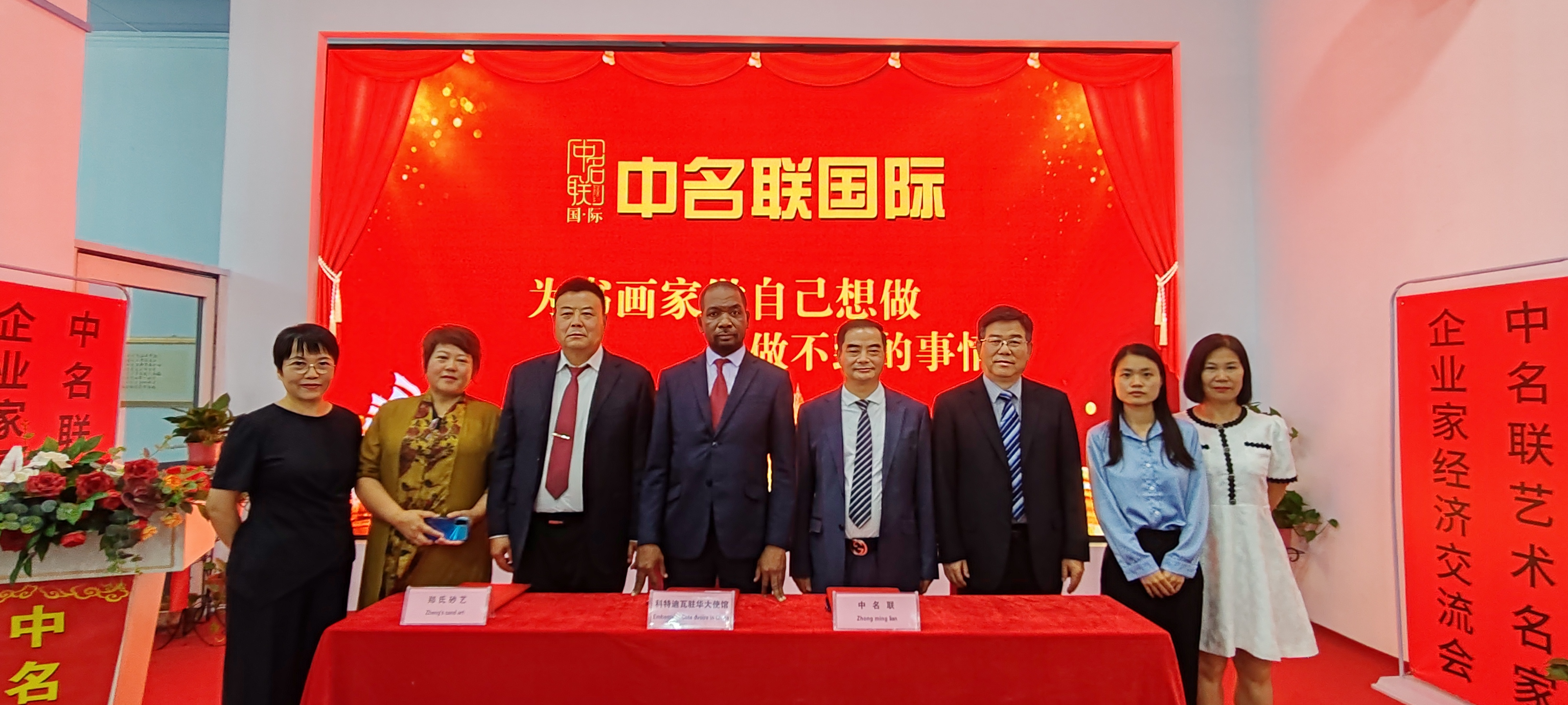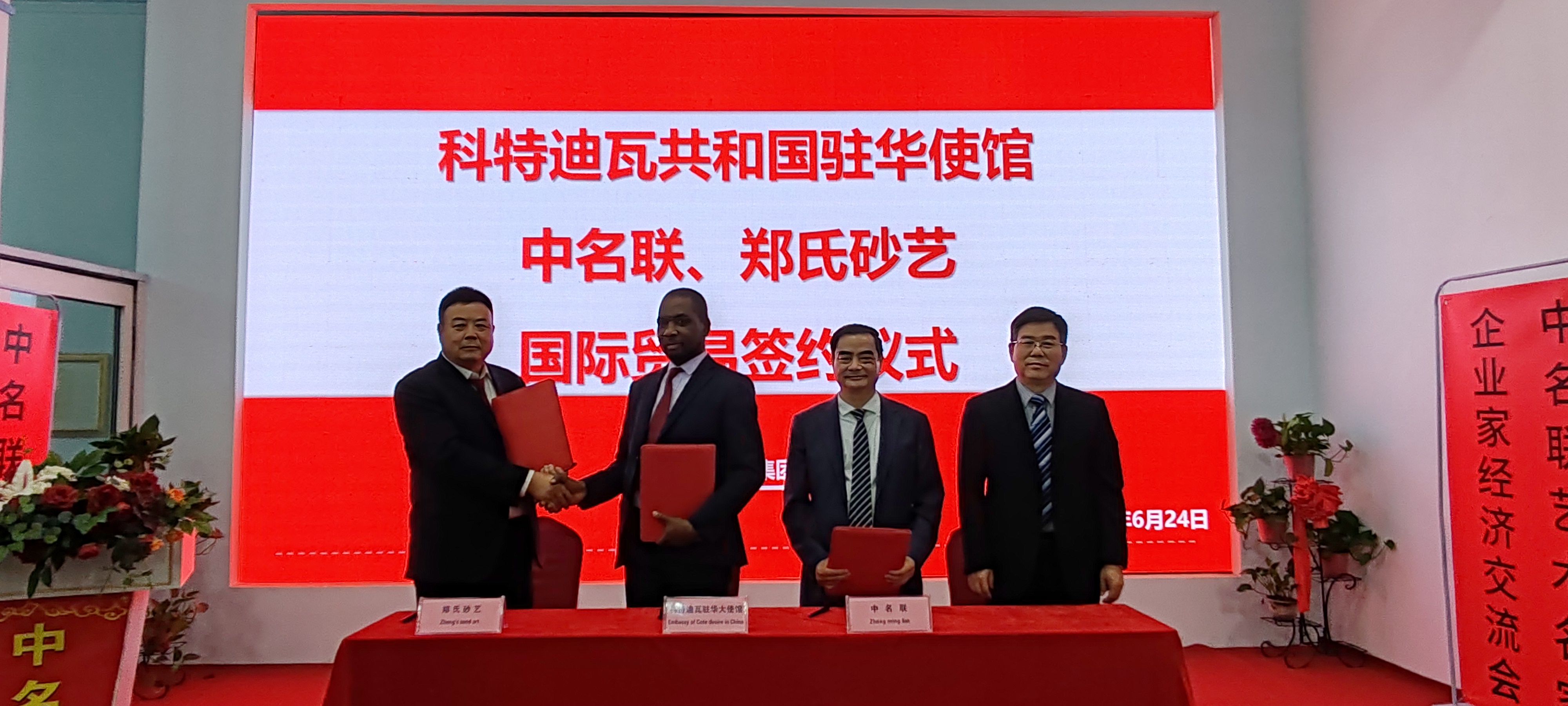 2024年6月24日,科特迪瓦共和國駐華使館、中名聯、鄭氏砂藝國際貿易簽約儀式在中名聯國際議會大廳成功舉辦,參加簽約儀式的有科特迪瓦共和國駐華使館參贊、中名聯集團董事長戴本領、鄭氏砂藝董事長鄭鐵軍、邯鄲市華冶工貿有限公司黨委書記董事長張書明和眾多中名聯簽約國禮藝術家和企業家們。